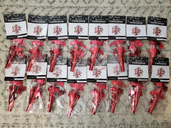 16 Centerpieces, 22 Table Covers (17 Blue + 5 Black), 60 Bubble vials, plus other decorations. All items are new in factory sealed packaging.