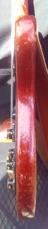 Looks to be original parts other than the bridge, which looks like a newer issue of the "Lightning Bolt" kind that would have been present from the factory and the tuners which are earlier vintage but type correct. It had a Gibson vibrato tailpiece at one time. The screw holes were filled and finished.