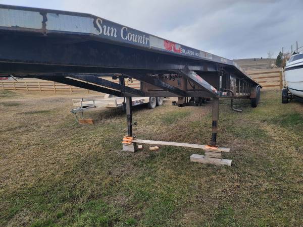 02 sun country 4 car trailer new bearings and brakes 10 thousand ago tires and spare are good has gooseneck adapter and 5th wheel plate 53 x102 with flip outs front and back
